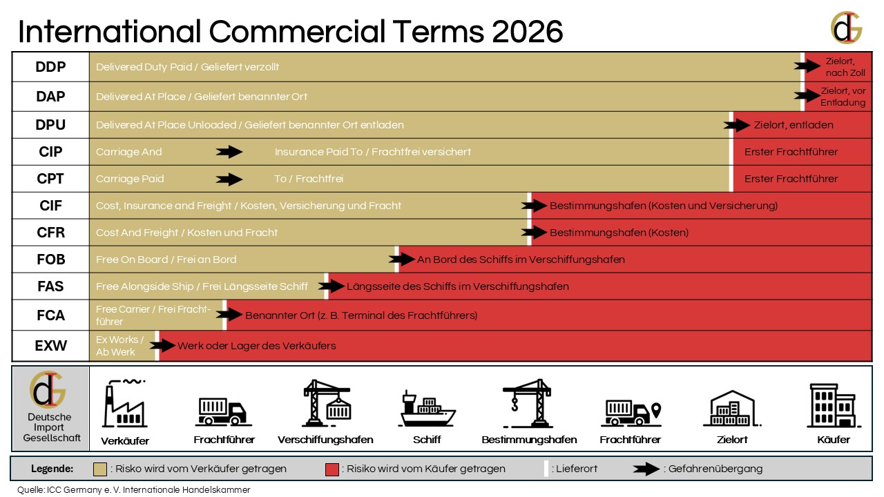 Im weltweiten Im- und Export Handel dienen die International Commercial Terms von 2026 (Incoterms 2026) der Regulierung von handelsüblichen Vertragsformulierungen. Die von der Internationalen Handelskammer (International Chamber of Commerce ICC) entwickelten Incoterms definieren die Rechte und Pflichten der jeweiligen Vertragspartner im internationalen Warenhandel. Mit der Aufnahme von Incoterms in den jeweiligen Handelsvertrag können im Falle des Falles Missverständnisse und Rechtsstreitigkeiten vermieden werden. Eine der wichtigsten Funktionen von Incoterms ist die Definition, ab welchem Zeitpunkt die Haftung bei Verlust oder der Beschädigung der Ware vom Verkäufer auf den Käufer übergeht. Im Folgenden gehen wir auf alle Incoterms ausführlich ein.
